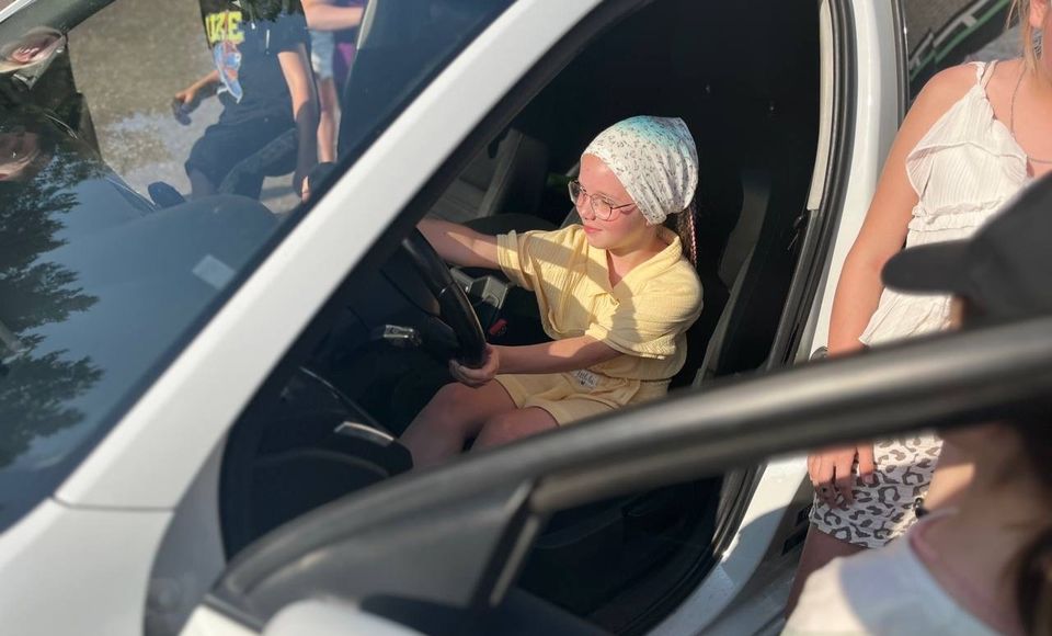 Но самой увлекательной частью стала экскурсия внутрь патрульного автомобиля ДПС! Инспектор показал устройство машины, объяснил назначение каждого прибора и даже включал спецсигналы и громкоговорители. Всем желающим дали попробовать пожать руль патрульной машины и подержать настоящий полицейский жезл!